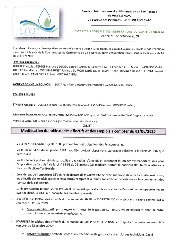 Deliberation 22 10 2020 Modification Tableau Effectifs Et Emplois
