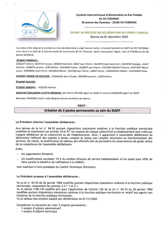 12 01 2020 Deliberation Creation De 2 Postes Au Sein Du Siaep