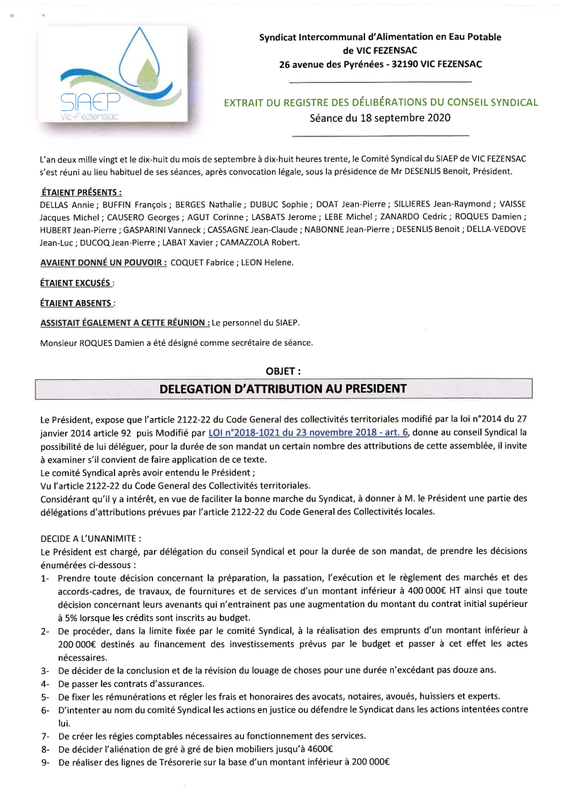 Deliberation 18 09 2020 Delegation D Attribution Au President Siaep