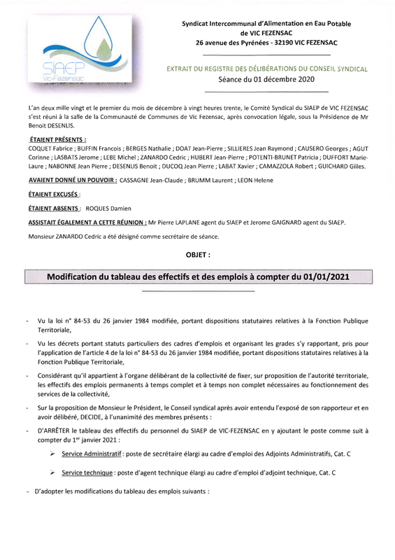 12 01 2020 Deliberation Modification Tableau Des Effectifs Et Emplois A Compter Du 01 01 2021