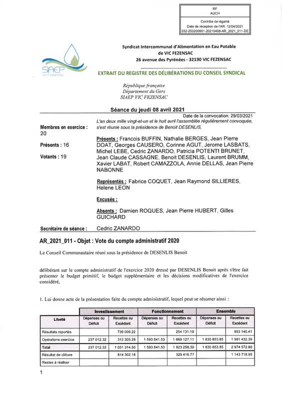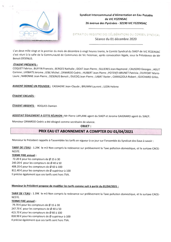 12 01 2020 Deliberation Prix Eau Abonnement A Compter Du 01 04 2021