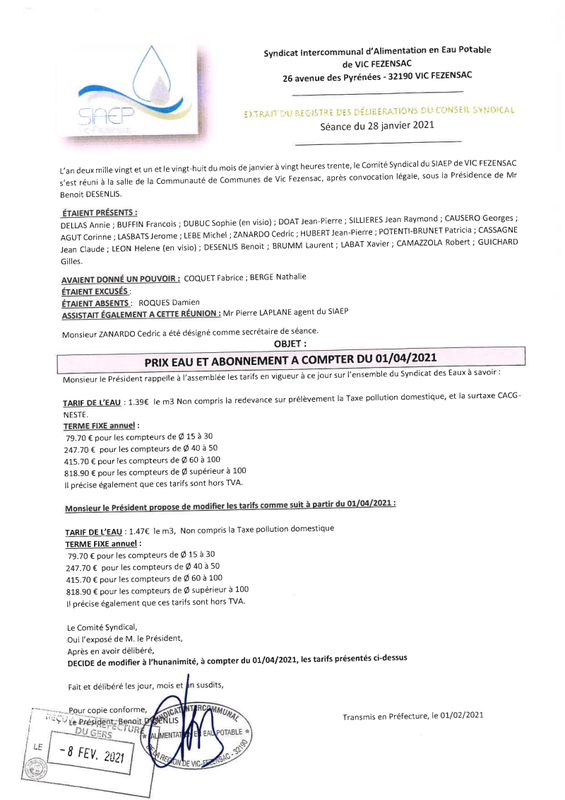 2021 01 28 Deliberation Prix Eau Et Abonnement A Compter Du 01 04 2021