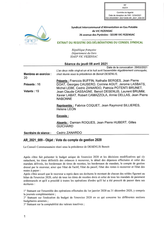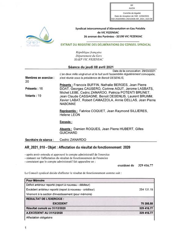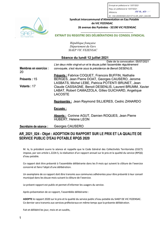 2021 024 Deliberation Adoption Du Rapport Sur Le Prix Et La Qualite De Service Public D'Eau Potable Rpqs 2020 Tamponne