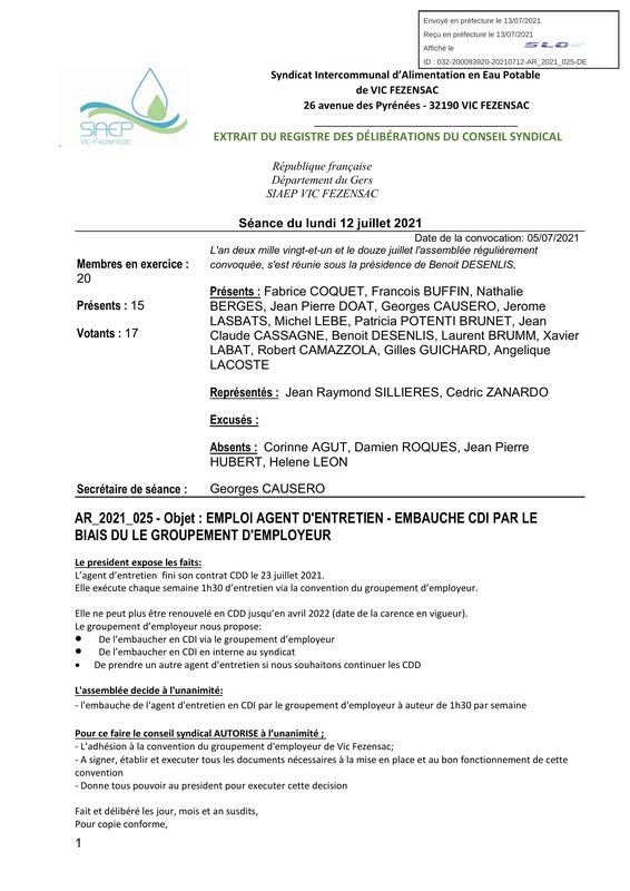 2021 025 Deliberation Emploi Agent D'Entretien Embauche Cdi Par Le Biais Du Le Groupement D'Employeur Tamponne