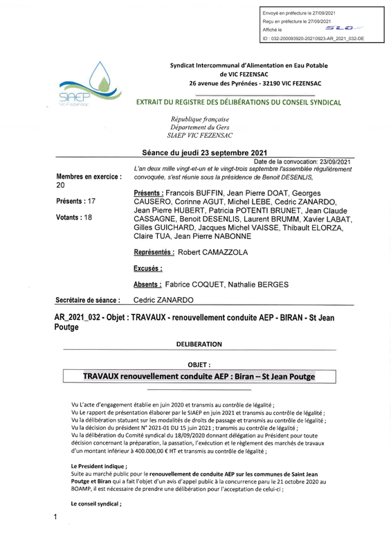 2021 032 Deliberation Travaux Renouvellement Conduite Aep Biran St Jean Poutge