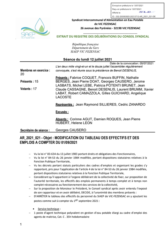 2021 021 Deliberation Modification Du Tableau Des Effectifs Et Des Emplois A Compter Du 01 09 2021 Tamponne