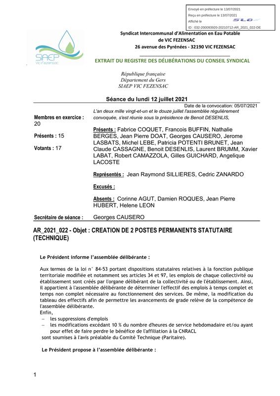2021 022 Deliberation Creation De 2 Postes Permanents Statutaire (Technique) Tamponne