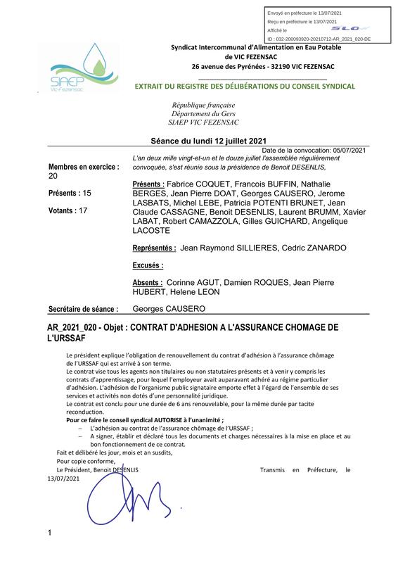 2021 020 Deliberation Contrat D'Adhesion A L'Assurance Chomage De L'Urssaf Tamponne