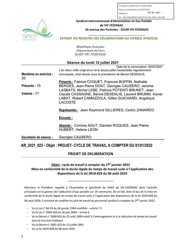 2021 023 Deliberation Projet Cycle De Travail A Compter Du 01 01 2022 Tamponne