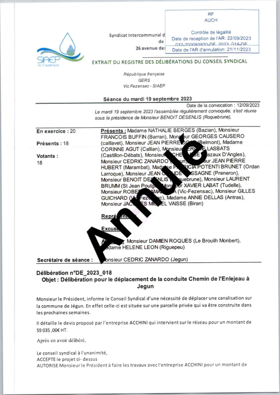 De 2023 018 Annule DéLibéRation Pour Le DéPlacement De La Conduite Chemin De L'Enlejeau À Jegun