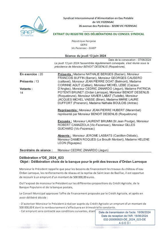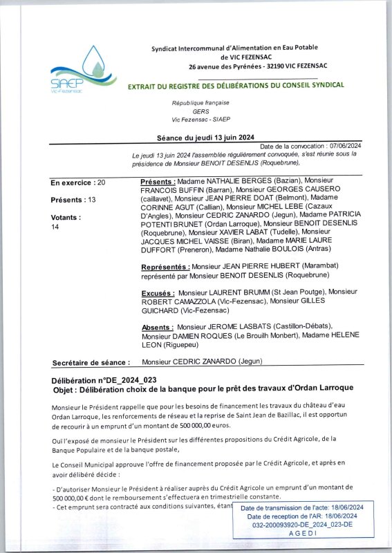 De 2024 023 DéLibéRation Choix De La Banque Pour Le PrêT Des Travaux D'Ordan Larroque