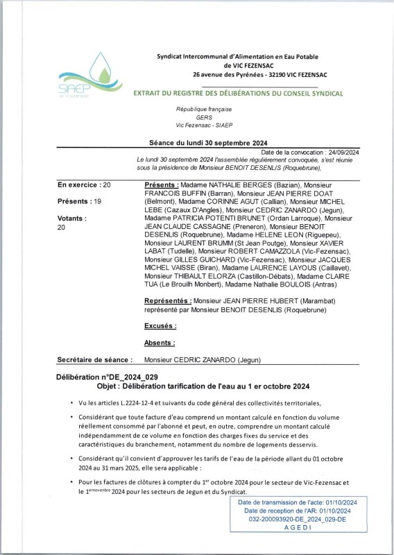 De 2024 029 DéLibéRation Tarification De L'Eau Au 01 Octobre 2024