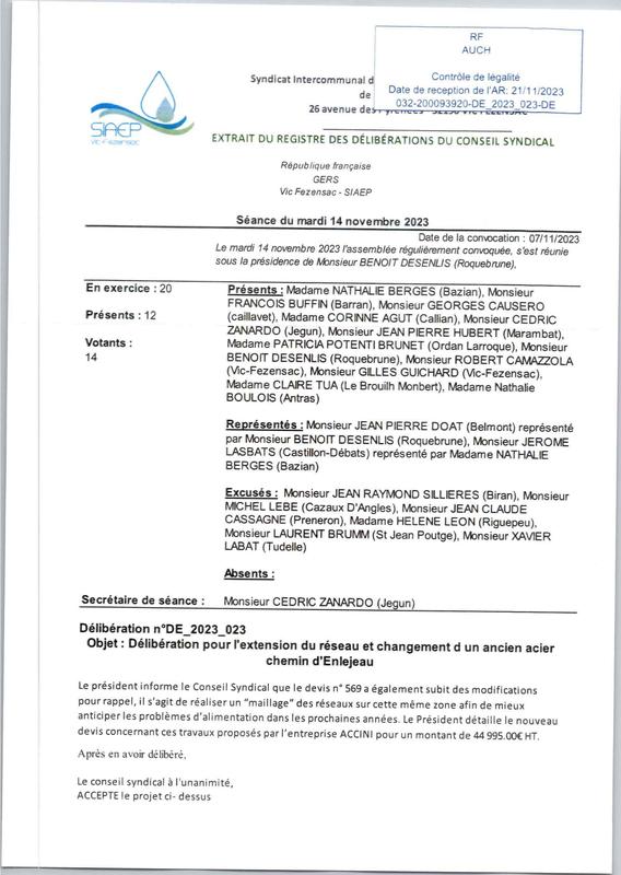 De 2023 023 DéLibéRation Pour L'Extention Du Reseau Et Changement D'Un Ancien Acier Chemin De L'Enlejeau